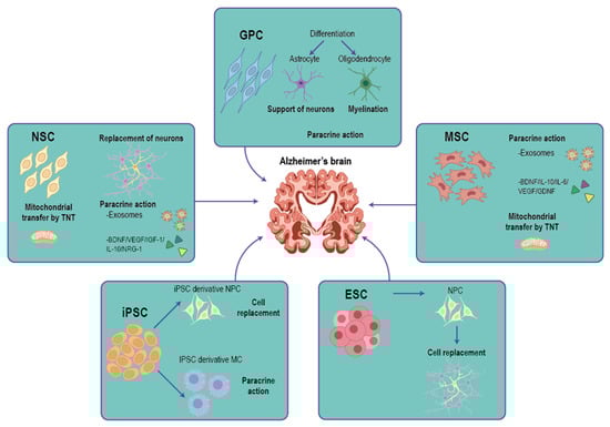 - Fouad, G.I. Stem cells as a promising therapeutic approach for Alzheimer’s disease: A review. Bull. Natl. Res. Cent. 2019, 43, 52. [Google Scholar] [CrossRef]