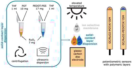 Two groups of sensors were prepared with layers composed of the synthesized RuO2-POT and RuO2–PEDOT materials. Firstly, the surfaces of glassy carbon disk electrodes were polished with alumina slurries and rinsed with water (twice) and methanol. The prepared surface of an electrode was cast with the use of a pipette with 15 μL of POT (first group of electrodes) and 20 μL of PEDOT (second group). These volumes were optimized in the scope of our previous works [,]. After the complete evaporation of THF, the layers were cast with ion-selective membranes to obtain ready-to-use potentiometric sensors. A schematic representation of the preparation process is presented in Figure 2.