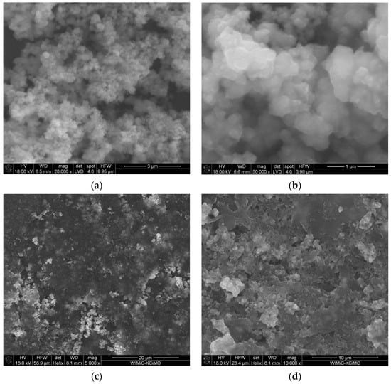 The SEM method was used to analyze the structures of the obtained oxide materials-to estimate the size of the grains and agglomerates and to confirm the homogeneity of the composition of the obtained hybrid materials. For this purpose, a dispersion of a polymeric material in THF was applied to platinum plates, and after evaporating the solvent, the samples were placed directly into the microscope chamber. Samples (hybrid metal oxide–conducting polymer materials) were examined using a LEO 1530 Scanning Electron Microscope by Carl Zeiss, Jena, Germany. For further examination of the composite materials, a Tecnai 20 X-TWIN Transmission Electron Microscope (FEI, Hillsboro, OR, USA) fitted with Energy Dispersive X-Ray (EDAX) Analysis and High Angle Annular Dark Field (HAADF) detectors was applied.