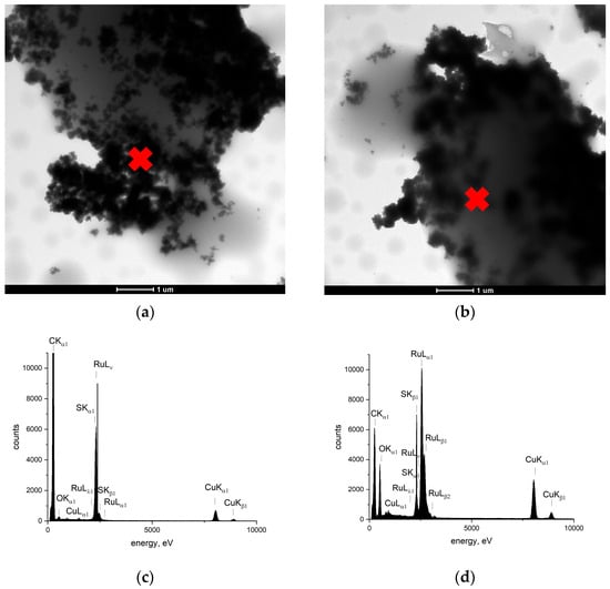 To thoroughly examine the microstructure of the composite materials, TEM scans were performed using a Tecnai 20 X-TWIN microscope (FEI, Hillsboro, OR, USA) with an EDAX detector. Scans of both synthesized materials are presented in Figure 4a (ruthenium dioxide-poly(3-octylthiophene)) and Figure 4b (ruthenium dioxide-poly(3,4-ethylenedioxythiophene) polystyrene sulfonate). The EDAX detector allowed us to investigate the composition of the materials, which are presented in Figure 4c,d. Ruthenium (as a part of RuO2) and sulfur were found at every point of the EDAX measurement, which proved that both components—the polymer and ruthenium dioxide—created a coherent composite material. What is important for each of the five randomly selected points is that we obtained remarkably similar EDAX spectra, on which the peaks of sulfur and ruthenium were comparable. This led to the conclusion that the proposed synthesis method turned out to allow the components to form a consistent and more homogeneous material.