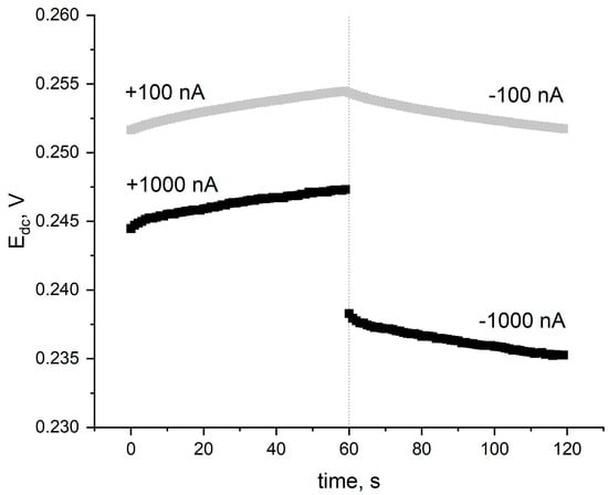 In the chronopotentiometric technique, according to the procedure given by Bobacka [], the program is set so that for 60 s there is a current flow (I) with a constant value of intensity. The direction of current flow changes between minute-long stages during the program for each electrode, and after each change, a jump in potential ∆Edc is observed. Based on the given potential values and current intensity (I), the following electrode parameters can be determined: total resistance, potential drift, and electrical capacity. The resistance is determined based on the potential jump (∆Edc) and the current flowing intensity (I): R = ∆Edc/2I. The greater the potential jump caused by changing the direction of current flow, the higher the resistance of the ion-selective electrodes. In the field of potentiometric sensors, the lowest possible resistance values are desirable, indicating low resistance to charge transfer at the interface of the electrode (or layer) and the membrane. The introduction of permanent contact layers allows for the improvement of exchange processes taking place at the phase boundary and lowering of the total resistance of the electrodes.
