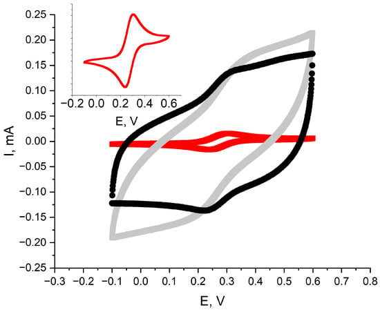 Cyclic voltammograms recorded for ruthenium dioxide-poly(3-octylthiophene) (RuO2-POT) (gray) and ruthenium dioxide-poly(3,4-ethylenedioxythiophene) polystyrene sulfonate (RuO2-PEDOT:PSS) (black) layers. Potential window: −0.2 to 0.6 V; scan rate: 100 mV/s; and 1 M KCl with 1 mM of potassium ferricyanide as electrolyte. Red voltammogram was recorded for glassy carbon disk electrode without any layers (enlarged in inset).