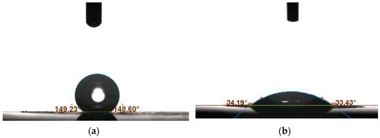 The wettability of the hybrid materials based on both tested conducting polymers was evaluated using a contact angle microscope. With materials applied as transducer layers in potentiometric sensors, high contact angle values are highly desirable, as the hydrophobicity of the layers ensures a long lifetime and high response stability of the sensors. Figure 7 presents the scans obtained using the contact angle microscope, after placing a droplet of water on the RuO2-POT (Figure 7a) and RuO2-PEDOT:PSS (Figure 7b) layers. The scans were analyzed with OneAttention software version 1.8 to determine the values of the contact angles.