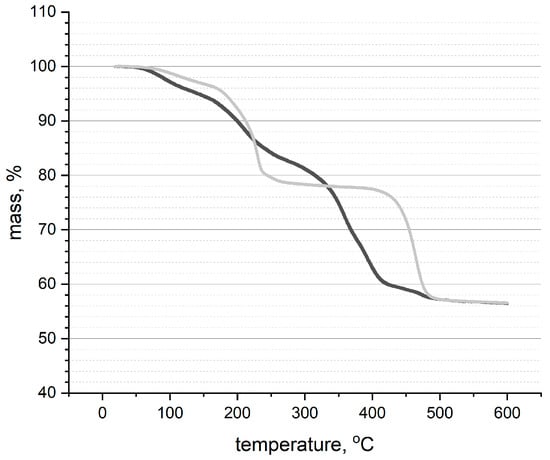 Thermogravimetric plots recorded in the argon atmosphere (4 °C/1 min until 600 °C) for a: ruthenium dioxide-poly(3-octylthiophene) (RuO2-POT) (gray) and b: ruthenium dioxide-poly(3,4-ethylenedioxythiophene) polystyrene sulfonate (RuO2-PEDOT:PSS) (black) layers.