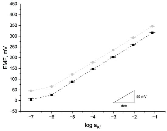 Potentiometric response towards potassium ions recorded for GC/RuO2-POT/K+ISM (gray circle) and CG/RuO2-PEDOT/K+ISM (black square) electrodes (n = 5 items from each group) after 24 h of electrode conditioning in the series of K+ ion 10−1 to 10−7 M solutions. Error bars depict the reproducibility of potentiometric response within each group of electrodes.