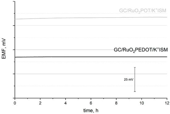 Potentiometric response towards potassium ions recorded for GC/RuO2-POT/K+ISM (gray line) and CG/RuO2-PEDOT/K+ISM (black line) electrodes in 10−2 M K+ ion solution for 12 h.