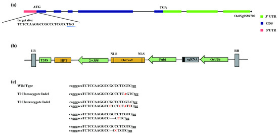 According to the experimental requirements, the knockout mutant of OsRLCK191 (LOC_Os05g51190) was constructed by the CRISPR/Cas9-based genome-editing method. The Cas9 plant expression vector (pHUN411-Cas9) and the sgRNA expression vector (pYLgRNA) were used in this study [43]. For designing gRNA targets, 20 bases upstream of the protospacer adjacent motif (PAM) were selected as candidate target sequences, where NGG is PAM (Figure 1a). A BLAST search (http://blast.ncbi.nlm.nih.gov/Blast.cgi, accessed on 30 July 2024) of the target sequences (including PAM) against the rice genome was conducted to confirm their targeting specificity in the genome. The target sequence has a difference of at least two bases compared with similar non-target sequences within the PAM region. The sgRNAs with a target sequence of OsRLCK191 were assembled into the vector pHUN411-sg2.0 with flanking primers containing BamHI restriction sites that generated pHUN411-sgRNA-rlck191 (Supplementary Table S1). Agrobacterium tumefaciens-mediated transformation (strain EHA105) of embryonic calli was conducted, which was then transformed into Suijing18. Hygromycin phosphotransferase (hpt), as a plant-selectable agent, was used for screening rice-positive transformants.