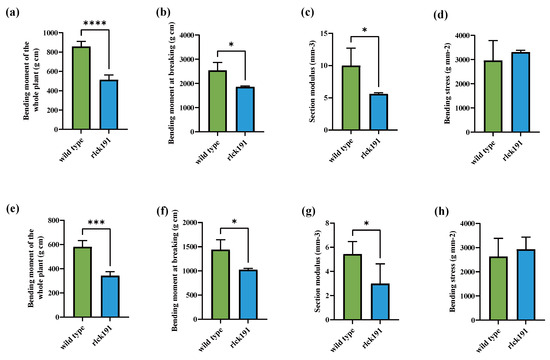 The identification of culm strength in homozygous mutant lines. (a–d) The bending moment of the whole plant, bending moment at breaking, section modulus, and bending stress of wild-type and mutant lines measured on the second internode. (e–h) The bending moment of the whole plant, bending moment at breaking, section modulus, and bending stress of wild-type and mutant lines measured on the third internode. Asterisks indicate significant differences between the wild type and mutant: p < 0.05 (Tukey’s test). *, ***, and **** represent significant differences at 5%, 1%, and 0.01% levels, respectively.Each bar indicates the mean ± SD (n = 6).