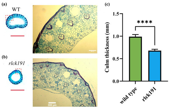 Cross-sections of the basal internode in wild type and rlck191. (a) Wild type. (b) Mutant type rlck191. Red dashed box indicates location of amplification. Red scale bars, 0.5 cm; White scale bars, 300 μm. (c) Culm thickness of wild type and rlck191. Each bar indicates mean ± SD (n = 6), **** represent significant difference at 0.01% level.