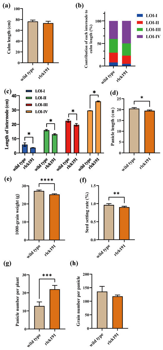 Agronomic trait values of wild type and mutant rlck191. (a) Culm length. (b) Contribution of each internode to plant height. I–V indicate internodes from base to head. (c) Length of each internode. Data are expressed as mean ± SD. *, **, ***, and **** represent significant differences at 5%, 1%, 0.1%, and 0.01% levels, respectively. Two-tailed Welch’s t-test was performed by Graphpad Prism 9.5 software. (d) Panicle length. (e) Thousand-grain weight. (f) Seed setting rate. (g) Panicle number per plant. (h) Grain number per panicle.