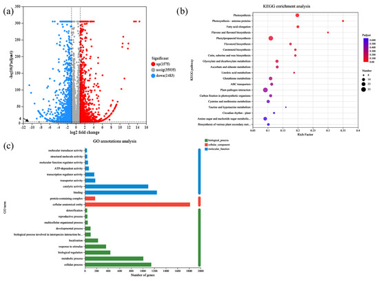 RNA-seq analyses of the rlck191 mutant. (a) The volcano map of DEGs between WT plants and mutant plants. (b) The KEGG enrichment analysis of the differentially expressed genes and proteins presented in a bubble chart. (c) The GO analysis of the DEGs. Enriched significantly different GO terms with both p value < 0.05 and p adjust < 0.001.