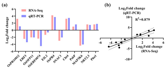 To confirm the DEGs identified from the transcriptome analysis, qRT-PCR was used to determine the expression levels of DEGs and 12 genes from different GO items that had been carefully selected (Supplementary Table S1). Subsequently, a correlation analysis was implemented. As illustrated in Figure 6, the correlation coefficient R2 was determined to be 0.879 between RNA-seq and qRT-PCR, which implies that the sequencing data of RNA-seq possesses a relatively high level of credibility.