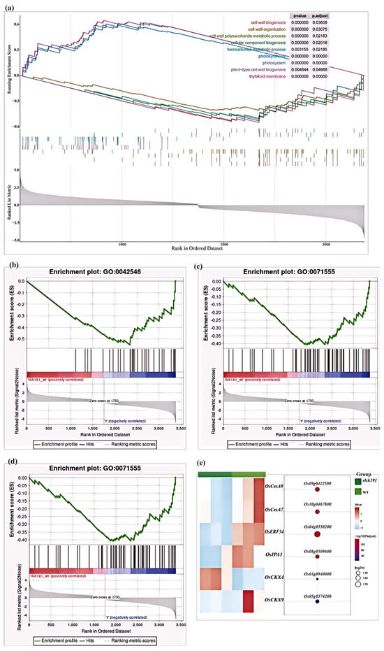 To further confirm that significant genes contain many regulatory factors, we performed a gene set enrichment analysis (GSEA) [36]. We found that the pathway of cell wall biogenesis, cell wall polysaccharide metabolic processes, and cellar component biogenesis were significantly enriched for downregulating in rlck191 (Figure 7a–d). Moreover, six genes were examined to be related to culm strength, which is responsible for the cytokinin oxidase/dehydrogenase family (OsCKX4, Os01g0940000 and OsCKX9, Os05g0374200), cellulose synthase catalytic subunit genes (OsCesA7, Os10g0467800 and OsCesA9, Os09g0422500), ethylene response factor family transcription factor (OsERF34, Os04g0550200), and squamosa promoter-binding protein-like (OsSPL14/IPA1, Os08g0509600), among which only one gene was upregulated, suggesting upregulation of these pathways (Figure 7e).