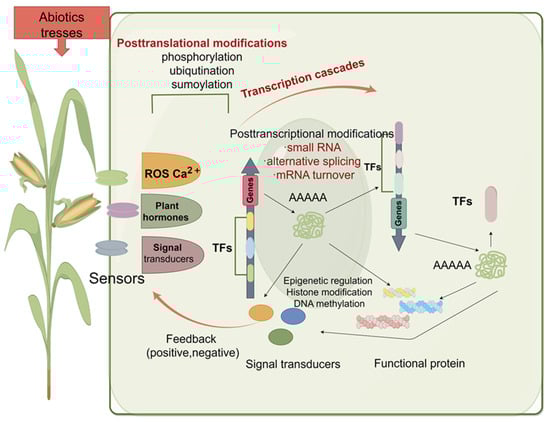 The above text describes how maize responds physiologically and biochemically to various adverse environmental conditions. It is observed that regardless of the type of stress maize encounters, the cell wall, cell membrane, and vacuoles are all involved, and osmotic, ionic, and oxidative regulations are indispensable. However, all complex physiological tolerance mechanisms rely on gene regulation at the molecular level. That is, plants can activate a series of genes involved in signal transduction and metabolic pathway regulation, reducing plant damage through the transcriptional activation and integration of effector genes mediated by transcription factors. In recent years, extensive research has been conducted on the stress resistance mechanisms of maize, and it has been found that when stress perception proteins within maize sense stress signals, they transmit these adverse signals within the plant. Generally, stress signals are thought to be initially perceived by membrane-bound proteins, which then stimulate downstream protein kinases and induce the expression of transcription factors (TFs) [37]. Secondary messengers, such as intracellular calcium ions (Ca2+) and reactive oxygen species (ROS), play an important role in the cellular signaling network responding to abiotic stress [38]. Different abiotic stresses often lead to similar secondary effects, including osmotic, ionic, and oxidative stress, triggering plant hormones, compatible osmolytes (small organic osmolytes, such as soluble sugars, polyols, amino acids, and their derivatives), and antioxidant enzymes (a group of proteins responsible for converting reactive oxygen into active molecules), protecting the stability of membranes, proteins, and cells [37]. Therefore, plants’ adaptation to environmental stress depends on the activation of molecular network cascades involved in stress signal perception, signal transduction, and the expression of specific stress-responsive genes (Figure 1).