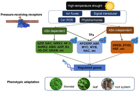 Under high-temperature and drought conditions, the physiological and biochemical mechanisms of maize stress resistance regulate the signal transduction process in response to drought, which includes ABA-dependent and ABA-independent pathways. For the ABA-dependent signal transduction process, dehydration signals stimulate local production of ABA in different plant organs. However, ABA production is found to be most efficient in the leaf mesophyll cells compared to the root tissues [43]. When ABA accumulates to a certain level, it stimulates downstream signaling and ABA functions in conjunction with other pathways.