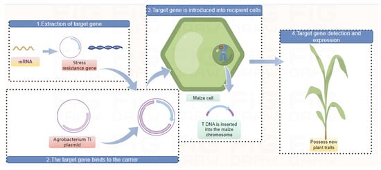 Through molecular breeding techniques, researchers have successfully cultivated some new varieties of maize with enhanced stress resistance, providing strong support for sustainable agricultural development. Genetic engineering technology involves direct manipulation of genes at the molecular level, breaking down barriers to gene exchange between different species and even completely different organisms, overcoming the obstacles of distant hybridization incompatibility, and introducing excellent genes from different sources into the recipient genome for a purpose, enriching the gene pool for resistance. The application of plant transgenic technology to improve crop varieties has shown tremendous potential, for example, introducing exogenous stress-related genes into maize to enhance its stress resistance and subsequently breed stress-resistant maize varieties. Selecting and establishing a good regeneration system is one of the key factors for the success of genetic transformation. Although various maize regeneration systems and genetic transformation systems have been established to adapt to different transformation methods and purposes, transformation methods such as gene guns and Agrobacterium-mediated transformation have been deeply studied, and a series of transgenic maize varieties have been put into agricultural production, the genetic transformation of maize is still very difficult, and there is no complete widely used transformation system, including in China. Therefore, strengthening research on maize regeneration systems and genetic transformation systems is of great significance [122].