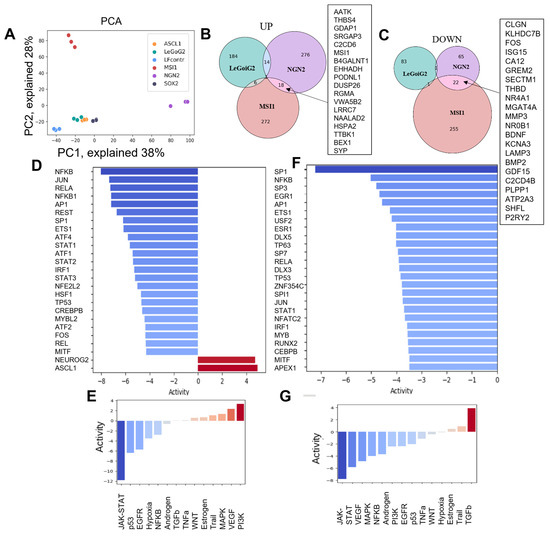 Differential expression analysis of RNA-seq data (A) Principal component analysis (PCA) of the log2 RNA-seq data presented as a two-dimensional scatterplot of the first two principal components. The sample groups are represented by different colors, each dot represents a biological replicate; the sample legend is provided within the plot; (B,C) Venn diagrams of the DEGs across LF1-NGN2, LF1-MSI1, and LF1-LeGoiG2 that were up- (B) and down- (C) regulated. (D–G) For LF1-NGN2 and LF1-MSI1, based on each TF’s targets amongst the DEGs, the top 25 most highly affected TFs are shown ((D,F), correspondingly), as well as the estimated pathway activity ((E,G), correspondingly).