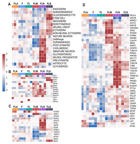 Profiles of cell subtypes in the samples based on gene expression analysis. Heatmap showing enrichment of the samples with DEGs of pro-neuronal cell populations (A), stem-like cells (B), neural crest cells (C), and radial glial cells (D). F, control fibroblasts LF1, FL, LF-LeGoiG2-Puro+, FLA, LF-LeGoiG2-Puro+-ASCL1, FLM, LF-LeGoiG2-Puro+-MSI1, FLN, LF-LeGoiG2-Puro+-NGN2, FLS, LF-LeGoiG2-Puro+-SOX2. Blue and red color scale represents the median-scaled change in gene expression or cell population enrichment (red—up, blue—down).