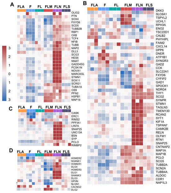 Profiles of cell subtypes in the samples based on gene expression analysis. Heatmap showing enrichment of the samples with DEGs of neural progenitors (A), neurons (B), presynaptic (C), and postsynaptic structures (D). F, control fibroblasts LF1, FL, LF-LeGoiG2-Puro+, FLA, LF-LeGoiG2-Puro+-ASCL1, FLM, LF-LeGoiG2-Puro+-MSI1, FLN, LF-LeGoiG2-Puro+-NGN2, FLS, LF-LeGoiG2-Puro+-SOX2. Blue and red color scale represents the median-scaled change in gene expression or cell population enrichment (red—up, blue—down).