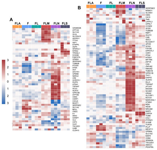 Profiles of cell subtypes in the samples based on gene expression analysis. Heatmap showing enrichment of the samples with DEGs of astrocytes (A) and oligodendrocyte precursors (B). F, control fibroblasts LF1, FL, LF-LeGoiG2-Puro+, FLA, LF-LeGoiG2-Puro+-ASCL1, FLM, LF-LeGoiG2-Puro+-MSI1, FLN, LF-LeGoiG2-Puro+-NGN2, FLS, LF-LeGoiG2-Puro+-SOX2. Blue and red color scale represents the median-scaled change in gene expression or cell population enrichment (red—up, blue—down).