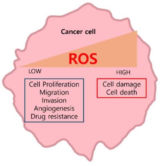 ROS are derived from various reactive oxygen species generated during metabolic processes, including mitochondrial oxidative phosphorylation (OXPHOS) [4]. They are crucial to numerous biological processes [4]. ROS function in a dual capacity: they act as signaling molecules that activate proliferation, migration, invasion, angiogenesis, and drug resistance pathways in cancer cells. Conversely, elevated ROS levels cause oxidative damage to proteins, nucleic acids, lipids, cell membranes, and organelles, ultimately leading to cell death (Figure 1) [5]. In this review, we provide a comprehensive analysis of how cancer cells utilize the ROS pathway and discuss strategies for leveraging ROS for therapeutic intervention in cancer.