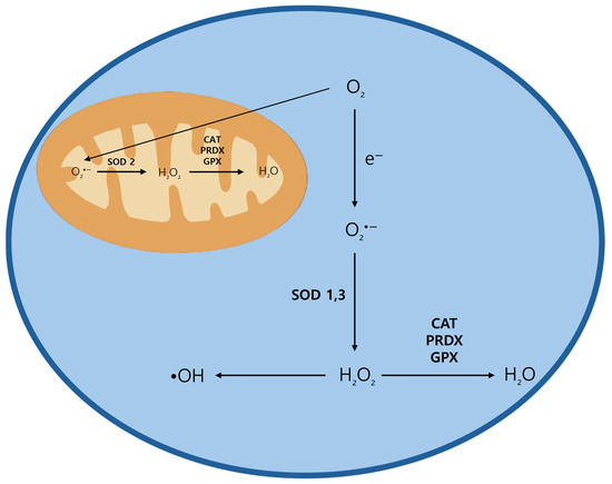 At low to moderate concentrations, ROS facilitate essential cellular functions such as proliferation, migration, and invasion. However, at higher levels, ROS inflict damage upon biomolecules, leading to cellular injury and cell death [5]. To regulate ROS, cells utilize several antioxidant enzymes, including superoxide dismutase (SOD), catalase (CAT), peroxiredoxin (PRDX), and glutathione peroxidase (GPX). These enzymes work in concert to neutralize highly reactive species like O2•− and other ROS, transforming them into less reactive molecules, such as H2O2, which is subsequently converted into water (Figure 2) [20]. ROS also activate multiple signaling pathways, notably the NRF2/KEAP1 pathway (nuclear factor erythroid 2-related factor 2/Kelch-like ECH-associated protein 1), a critical mechanism for regulating ROS levels. When ROS modify KEAP1, they inhibit its ability to degrade NRF2, allowing NRF2 to translocate into the nucleus and promote the expression of cytoprotective genes. Additionally, other pathways such as nuclear factor-κB (NF-κB), phosphoinositide 3-kinase (PI3K)/AKT, and mitogen-activated protein kinase (MAPK) are activated. These pathways play key roles in inflammatory and immune responses and contribute to cell growth, survival, or apoptosis, depending on cellular context [21].