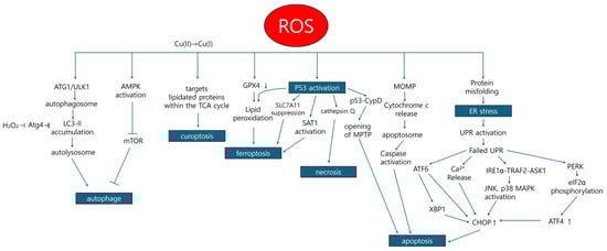Copper plays an essential role in various critical biological processes, including energy metabolism, ROS detoxification, iron uptake, and signal transduction in eukaryotes. In the mitochondrial matrix, copper is utilized by respiratory complex IV (cytochrome c oxidase) and the antioxidant enzyme superoxide dismutase 1 [144]. Given copper’s involvement in mitochondrial OXPHOS, both copper deficiency and excess can lead to mitochondrial dysfunction, resulting in increased ROS production and subsequent cell death. An imbalance in copper levels has also been shown to affect cell proliferation and differentiation [144].