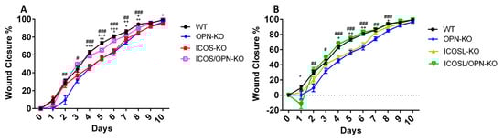 The wound closure rate in mice with different genotypes: osteopontin knock out (OPN-KO), Inducible T-cell costimulator knock out (ICOS-KO), ICOS ligand knock out (ICOSL-KO), ICOS/OPN-KO and ICOSL/OPN-KO. (A) The graph shows the wound closure rate of WT (n = 21) compared to OPN-KO (n = 19), ICOS-KO (n = 16), and ICOS/OPN-KO (n = 24). WT vs. ICOS/OPN-KO: * p < 0.05; ** p < 0.005; WT vs. ICOS-KO: + p < 0.05; ++ p < 0.01; +++ p < 0.0001; WT vs. OPN-KO: # p < 0.05; ## p < 0.005; ### p < 0.001. (B) The graph shows the wound closure rate of WT (n = 21) compared to OPN-KO (n = 19), ICOSL-KO (n = 18), and ICOSL/OPN-KO (n = 17). WT vs. ICOSL/OPN-KO: * p < 0.005; WT vs. ICOSL-KO: + p < 0.005; ++ p < 0.001; WT vs. OPN-KO: # p < 0.05; ## p < 0.005; ### p < 0.001. The graphs show the % of wound closure calculated using the following formula: (Wound AreaT0-Wound AreaTX)/Wound AreaT0 × 100. The statistical analysis is calculated by the Mann–Whitney test.