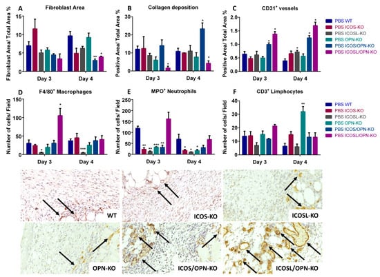 Histological analyses of the healing sites were performed at day 3 (T3) and 4 (T4) after the wound by evaluating the fibroblast levels by hematoxylin and eosin (H&E) and collagen fiber deposition by picrosirius red staining. Moreover, blood vessels formation and the recruitment of T cells, neutrophils, and macrophages were evaluated by the immunohistochemical staining of CD31, CD3, MPO, and F4/80, respectively. The results were analyzed by comparing the differences, at either T3 or T4, between WT and each KO strain (Figure 2). In detail, Figure 2A shows that the fibroblast levels were not significantly altered in all single-KO strains, but they were decreased in both double-KO strains (at T4). Figure 2B indicates that the collagen levels were not significantly changed in the single KO strains, but they were decreased in ICOSL/OPN-KO mice (at T3 and T4), and increased in ICOS/OPN-KO mice (at T4). Figure 2C displays data regarding the vessel formation that was not significantly altered in OPN-KO and ICOS-KO mice, but it was increased in ICOSL-KO mice (at T4) as well as in ICOSL/OPN-KO and ICOS/OPN-KO mice (both at T3 and T4). Figure 2D shows that the presence of macrophages was not significantly changed in ICOS-KO, OPN-KO, and ICOS/OPN-KO mice, while it was decreased in ICOSL-KO mice (at T3 and T4), and increased in ICOSL/OPN-KO mice (at T3). Figure 2E shows that the neutrophil levels were not significantly changed in ICOSL/OPN-KO mice, but they were decreased in all the other KO strains (at T3 and T4). Figure 2F shows that the T cells were not significantly changed in any knockout strain except for an increase in OPN-KO mice (at T4).