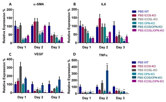 To better characterize the inflammatory and fibrogenic microenvironment of the wound healing sites, we assessed the mRNA levels of IL-6, VEGF, TNFα, α-SMA (marking myofibroblasts), TREM1 and TREM2 (marking M1 and M2 macrophages, respectively) at day 1, 2, and 3 by real-time PCR. The results were analyzed by comparing the differences, at each time point, between WT and each KO strain (Figure 3). Figure 3A shows that α-SMA was significantly decreased in all KO strains; at T3 in ICOS-KO, ICOSL-KO, and ICOSL/OPN-KO mice, and at all time points in OPN-KO and ICOS/OPN-KO mice. Figure 3B shows that IL-6 was decreased in all KO strains; at T3 in ICOS-KO, ICOSL-KO, and OPN-KO mice, at T1 and T3 in ICOSL/OPN-KO mice, and at all time points in ICOS/OPN-KO mice. Figure 3C shows that VEGF was not significantly changed in ICOS/OPN-KO mice, whereas it was decreased in ICOSL/OPN-KO (at T2 and T3), and ICOS-KO, ICOSL-KO, and OPN-KO mice (at T2). Figure 3D shows that TNFα was significantly lowered in OPN-KO and ICOSL/OPN-KO mice (at all time points), and ICOS-KO and ICOSL-KO mice (at T1 and T3). In contrast, it was decreased at T1 and T3 and increased at T2 in ICOS/OPN-KO mice. Finally, the TREM2/TREM1 ratio was not significantly changed in any knockout strain.