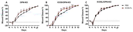 The effect of the ICOS-Fc treatment on wound closure in OPN-KO, ICOS/OPN-KO, and ICOSL/OPN-KO mice. The graphs show the % of wound closure in (A) OPN-KO mice (n = 28–11), (B) ICOS/OPN-KO mice (n = 24–9), and (C) ICOSL/OPN-KO mice (n = 14–10) following the treatment with PBS or ICOS-Fc. The graphs show the % of wound closure calculated as previously described in Figure 2. * p < 0.05; ** p < 0.005; *** p < 0.001 are calculated by the Mann–Whitney test.