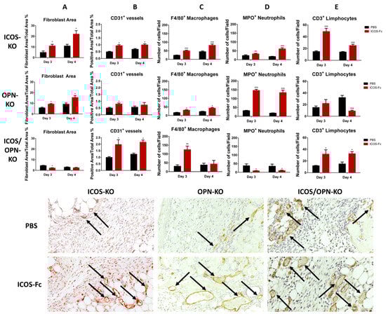 Our past work [] illustrated that, in WT mice, the treatment of skin wounds with ICOS-Fc increases blood vessels and fibroblasts, and the infiltration of T cells and macrophages, whereas it decreases neutrophils []. To discriminate the role of the different components of the ICOS/ICOSL/OPN network in the ICOS-Fc effects, we extended the histological analyses to OPN-KO, ICOS/OPN-KO, and ICOSL/OPN-KO mice treated or not with ICOS-Fc. The results were analyzed by comparing the differences, at each time point, between the wounds treated with PBS (control) or ICOS-Fc. As expected, ICOS-Fc did not exert significant effects on any of these parameters in the mouse strains deficient in ICOSL, i.e., ICOSL-KO and OPN/ICOSL-KO mice. In contrast, it exerted variable effects in the mouse strains expressing ICOSL, i.e., ICOS-KO, OPN-KO, and OPN/ICOS-KO (Figure 5). Figure 5A shows that the treatment with ICOS-Fc significantly increased the fibroblast levels in ICOS-KO and OPN-KO mice at T3 and T4, similarly to WT mice. In contrast, it decreased the fibroblasts in OPN/ICOS-KO mice at T3. Figure 5B,C show that the treatment with ICOS-Fc significantly increased the number of vessels and macrophages in ICOS-KO, OPN-KO, and ICOS/OPN-KO mice, similarly to WT mice []. Specifically, the blood vessel numbers were increased at T3 and T4 in ICOS-KO and ICOS/OPN-KO mice, and at T3 in OPN-KO mice; the macrophages were increased at T3 and T4 in ICOS-KO and OPN-KO mice, and at T3 in ICOS/OPN-KO mice. Figure 5D shows that the treatment with ICOS-Fc decreased the neutrophil levels in ICOS/OPN-KO mice at T3 and T4, similarly to WT mice. In contrast, it increased the neutrophil levels in ICOS-KO and OPN-KO mice at T3 and T4. Figure 5E shows that the treatment with ICOS-Fc increased the number of T cells in ICOS-KO and ICOS/OPN-KO mice at T3 and T4, similarly to WT mice. In contrast, it decreased the T cell levels in OPN-KO mice at T4.