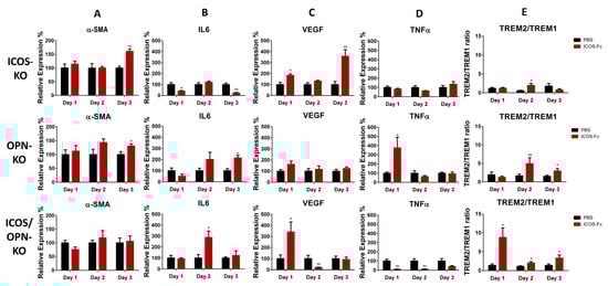 The previous work showed that, in WT mice, the treatment of skin wounds with ICOS-Fc increased the local expression of α-SMA, IL-6, VEGF, and TREM2/TREM1 ratio, and decreased the TNFα levels []. Therefore, we analyzed the effect of the treatment with ICOS-Fc in the KO mouse strains. The results were analyzed by comparing the differences, at each time point, between the wounds treated with PBS (control) or ICOS-Fc. The results showed that the treatment with ICOS-Fc did not exert any effect in ICOSL-KO and ICOSL/OPN-KO mice, as expected. In contrast, it exerted variable effects in ICOS-KO, OPN-KO, and OPN/ICOS-KO mice (Figure 6). Figure 6A shows that the treatment with ICOS-Fc significantly increased the α-SMA expression in ICOS-KO and OPN-KO mice at T3, similarly to WT mice. In contrast, it had no effect on OPN/ICOS-KO mice. Figure 6B shows that the treatment with ICOS-Fc significantly increased the IL-6 expression in OPN-KO mice at T3 and ICOS/OPN-KO mice at T2, similarly to WT mice. In contrast, it decreased IL-6 in ICOS-KO mice at T1 and T3. Figure 6C shows that the treatment with ICOS-Fc significantly increased the VEGF expression in ICOS-KO mice at T1 and T3, similarly to WT mice. In contrast, it decreased VEGF in OPN/ICOS-KO mice at T2 and had no significant effect in OPN-KO mice. Figure 6D shows that the treatment with ICOS-Fc decreased the TNFα expression in OPN/ICOS-KO mice at T1 and T2, similarly to WT mice. In contrast, it increased TNFα in OPN-KO mice at T1 and had no significant effect in ICOS-KO mice. Figure 6E shows that the treatment with ICOS-Fc increased the TREM2/TREM1 expression ratio in ICOS-KO mice at T2, OPN-KO mice at T2 and T3, and ICOS/OPN-KO mice at T1, T2, and T3.