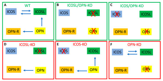 The signaling pathways serving the ICOS/ICOSL/OPN network involve those activated by the ICOS- or OPN-mediated triggering of ICOSL; those activated by the ICOSL-mediated triggering of ICOS; and those activated by the OPN-mediated triggering of the various cell receptors bound by OPN, including several integrins and CD44 (Figure 7). Each of these pathways exerts several effects in multiple cell types since ICOSL and the other OPN receptors are widely expressed in immune and non-immune cells. ICOS itself, for a long time considered to be selectively expressed in T cells, has been found also in other cell types such as dendritic cells, macrophages, and plasma cells [,]. The global network of these pathways is differently unbalanced in each single-KO strain (Figure 7D–F), and it would be mostly silenced in the double-KO mice (Figure 7B,C). Therefore, these data suggest that wound healing is impaired when the functioning of the ICOS/ICOSL/OPN network is unbalanced but not when it is globally defective.