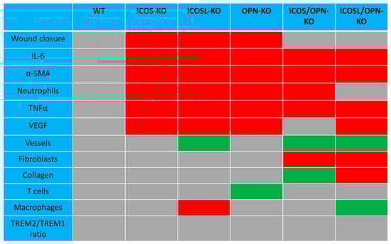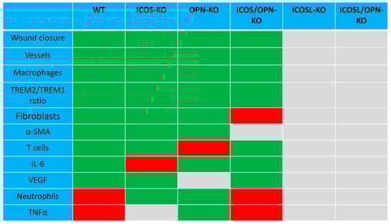 Scheme of the effects exerted by ICOS-Fc on the wound healing closure and cellular and molecular healing markers in wild type and knockout mice. Grey boxes: no effect induced by ICOS-Fc; red boxes: decrease induced by ICOS-Fc; green boxes: increase induced by ICOS-Fc.