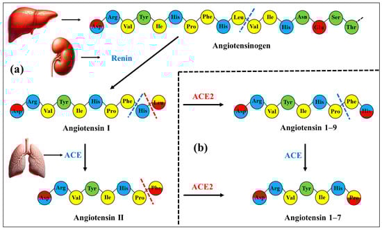 Renin-angiotensin system. Subsection (a) on the left: Renin and angiotensin-converting enzyme (ACE) action. The precursor α-2-globulin angiotensinogen is produced by hepatocytes. The renal enzyme renin cleaves the covalent peptide bond after the first 10 amino acids from the N-terminus of angiotensinogen, leading to the formation of angiotensin-I (first reaction). This decapeptide is converted by the pulmonary angiotensin-converting enzyme (ACE) to the octapeptide angiotensin-II by the cleavage of the last two amino acid residues, resulting in the emergence of a carboxylic group on the C-terminus (second reaction). Subsection (b) on the right: Angiotensin-converting enzyme-2 (ACE2) action. The angiotensin-converting enzyme-2 (ACE2) cleaves one amino acid residue from the C-terminus of both angiotensin peptides, which leads to the formation of the nonapeptide angiotensin-1–9 and the heptapeptide angiotensin-1–7, respectively. The cleaved peptide bonds (in the two subsections) are shown by dotted lines colored according to the corresponding enzyme: blue (ACE) or red (ACE2). The amino acid residues are colored according to their charge and hydrophilicity: green (uncharged hydrophilic), blue (positively charged hydrophilic), red (negatively charged hydrophilic), and yellow (uncharged hydrophobic); the charges are determined at neutral pH. The end-side residues are marked by double color considering the protonated α-amino group (NH3+–) on the N-terminus and the deprotonated carboxylic group (–COO−) on the C-terminus. The N-end aspartic acid (Asp) residue bears one positive (NH3+–) and one negative (COO−–) charge. The C-end histidine (His) residue of the angiotensin-1-9 bears one negative charge (the deprotonated carboxyl group) and one positive charge at acid pH (the protonated imidazole group), which disappears at basic pH. The C-ends of the remaining three peptides have only negative charge (–COO−).