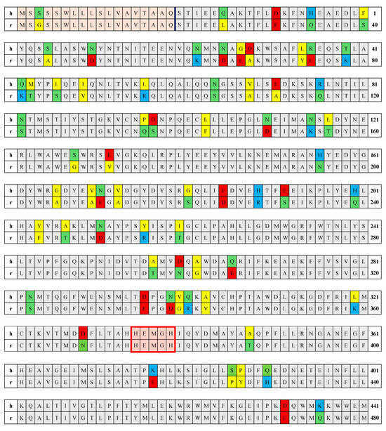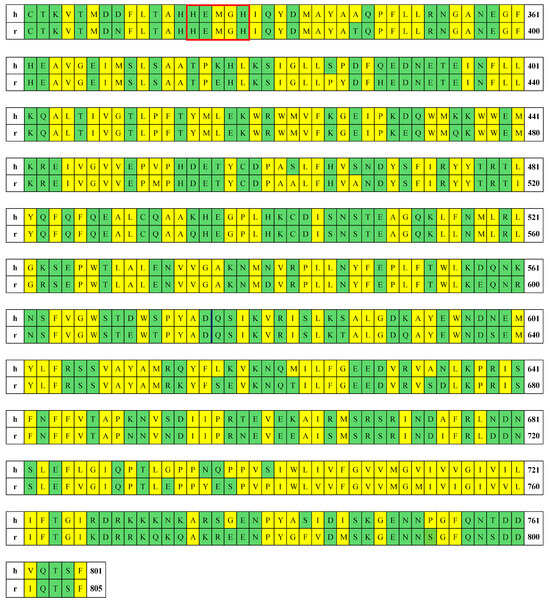 Primary amino acid sequence of the polypeptide chains of human (the rows beginning with h) and rabbit (r) ACE2. The numbers at the end of every row indicate the first and the last amino acid residue on the corresponding row. The amino acid residues are denoted according to the standard one-letter code. The cells of the different residues are colored according to the electric charge at pH 7.0 and the hydrophilicity of the given residue: red (negatively charged hydrophilic), blue (positively charged hydrophilic), green (uncharged hydrophilic), and yellow (uncharged hydrophobic). The polypeptide chain is divided (indicated by vertical lines) into three segments: signal peptide (amino acid residues 1–18, colored in bright orange), catalytic domain (19–615, colored in bright gray), and transmembrane segment (616–805 colored in bright purple). The five residues included in the zinc-binding motif HEMGH of the active center of the enzyme are denoted by the red rectangle.