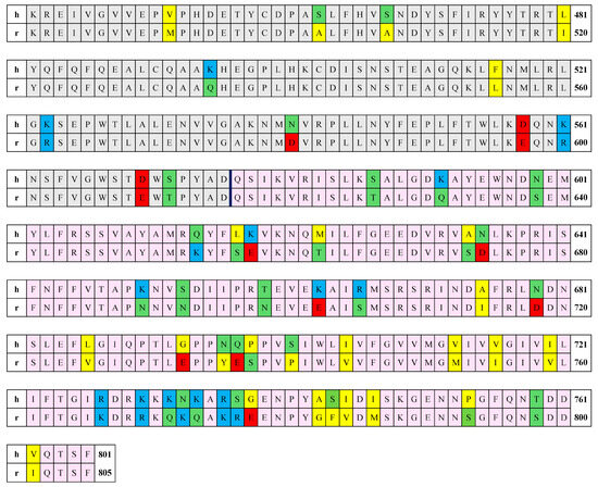 As a first step, we compared the amino acid sequences of the polypeptide chains of the two ACE2 proteins corresponding to their genetic code. The chain is divided into three segments demarcated by vertical lines in Figure 2 (amino acid residues are numbered from the N-terminus): (a) signal peptide 1–18, (b) catalytic domain 19–615, and (c) transmembrane segment 616–805. The distinctive residues between hACE2 and rACE2 are colored based on their polarity and charge, with negatively charged hydrophilic aspartic acid (D) and glutamic acid (E) in red; positively charged lysine (K), arginine (R), and histidine (H) in blue; and uncharged hydrophilic serine (S), asparagine (N), threonine (T), glutamine (Q), and cysteine (C) in green; and the uncharged hydrophobic tryptophan (W), leucine (L), methionine (M), alanine (A), isoleucine (I), glycine (G), valine (V), phenylalanine (F), tyrosine (Y), and proline (P) in yellow. The identical amino acids are uncolored. Comparison of the primary amino acid sequence of the two proteins shows a high identity of 85% between the two chains (686 of 805 residues are identical, and 119 are different), and no deletions are present. As it can be seen on Figure 2, a great number of point mutations (41 of 197 amino acid residues are different) is concentrated in the transmembrane collectrin-like segment, but only 10 of them (less than one fourth) are associated with a change in hydrophobicity and hydrophilicity. The catalytic segment of both chains is composed of 597 amino acid residues, 520 of which are identical; the different 77 amino acid residues are 12.9%. The full identity of the amino acid residues in the enzyme active center (histidine 374, 378, 505; glutamic acid 375, 402, 406; and tyrosine 515) suggests a complete overlap in the functional aspects. In other words, rabbit ACE2 should work with the same substrates as human ACE2. However, the high compositional identity does not mean that the two chains are folded identically, i.e., it cannot be said in advance that their 3D structures are analogous.