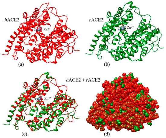 (a–d) 3D structure models of the human (red, hACE2) and rabbit (green, rACE2) catalytic domains of the angiotensin-converting enzyme-2 (the upper two models (a,b)); the α-helix segments are depicted as ribbon spirals. The model of the rabbit ACE2 (b) is reconstructed by replacement of the different amino acid residues in the hACE2 (PDB: 1r42) model (a). The violet spherical object (Zn2+) is the zinc atom in the enzyme active center. The low two models (c,d) present the aliment (hACE2+rACE2) of the human and rabbit ACE2 in two different projections: the 3D volume of the protein globules (the ribbon model on the left) (c) and the 2D surface of the globules (the atomic model on the right) (d). The right bottom model (d) presents the atoms exposed on the surface of the aligned two protein globules; the atoms are colored fully in red (hACE2) or green (rACE2) when they are entirely protruded above the others, or in mixed color when their coordinates partially coincide. The brightness, shade, and color nuance of the atomic images give the impression for a quasi 3D surface of the protein globules.