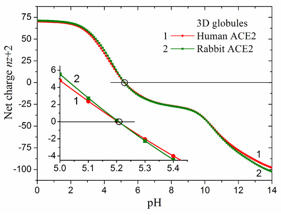 pH dependences of the net electric charge nz + 2 of the globular catalytic domain of human (PDB: 1r42, hACE2, red curve 1) and reconstructed rabbit (rACE2, green curve 2) angiotensin-converting enzyme-2 in 3D conformation of the polypeptide chain in aqueous medium. The net charge of the two globular domains is the algebraic sum of the positive and negative coulombic charges of the polypeptide chain with the addition of two positive charges of the Zn2+ atom in the catalytic center. Insert: pH dependence of hACE2 (red curve 1) and rACE2 (green curve 2) with denoted isoelectric point (nz = 0): pI 5.21 (human) and pI 5.21 (rabbit) ACE2.
