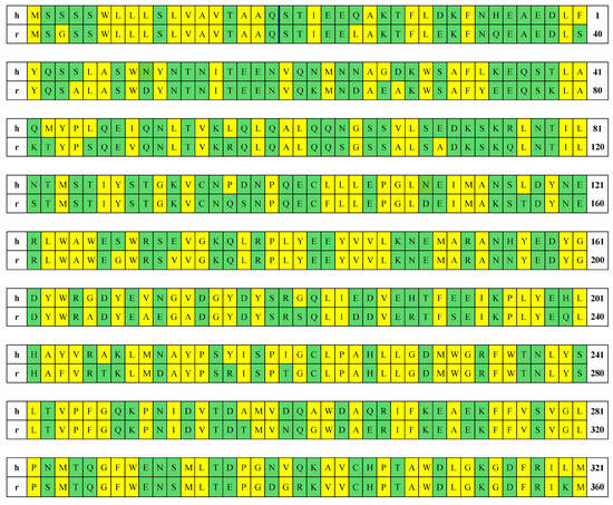 Amino acid sequence of the polypeptide chains of human (rows beginning with h) and rabbit (r) ACE2. The numbers at the end of every row indicate the first and the last amino acid residue on the corresponding row. The cells of the amino acid residues (denoted by the standard one-letter code) are colored according to their affinity to the water molecules: hydrophilic (green) or hydrophobic (yellow). The vertical lines and the red rectangle denote the beginning and the end of the catalytic domain and the amino acid residues from the zinc-binding motif included in the enzyme active center, respectively.