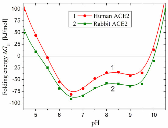 pH dependences of the electrostatic component ΔGel of the folding energy ΔGfold of the human (hACE2, PDB: 1r42, curve 1) and reconstructed rabbit (rACE2, curve 2) polypeptide chains of angiotensin-converting enzyme-2 at the transformation of the polypeptide chain from fully unfolded (random coil) to folded (globular 3D structure) conformation. The two 3D models are optimized by the program YASARA.
