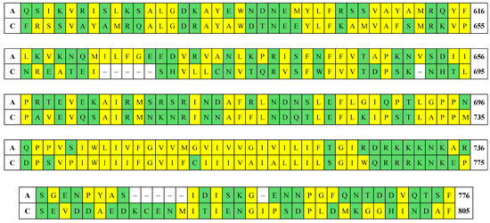 Amino acid sequence of the polypeptide chains of transmembrane collectrin-like segment of the human ACE2 (the rows denoted by A) and human collectrin (C). The numbers at the end of every row indicate the first and the last amino acid residue on the corresponding row (the numbering corresponds to that in the hACE2 shown in Figure 6). The cells of the amino acid residues (denoted by the standard one-letter code) are colored according to their affinity to water: hydrophilic (green) or hydrophobic (yellow). The absent amino acid residues are denoted by dashes.