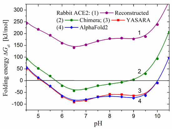 Figure 9 presents the electrostatic components ΔGel of the folding energy calculated for 3D models of rACE2, which are reconstructed by two different approaches. The first one is based on an experimental 3D model of hACE2, which is modified by mutagenesis according to the primary amino acid sequence of rACE2 (curve 1), after which the model has been optimized to reach the most energetically advantageous atomic coordinates (curves 2 and 3). The second approach is based on the construction of a 3D model beginning directly from the primary amino acid sequence of rACE2, for which purpose we employed the program AlphaFold2. The practical coincidence of curves 3 and 4 shows that 3D models of rACE2, obtained by these two alternative computer techniques, have practically equal thermodynamic stability. The coincidence reflects almost the same coordinates of the coulomb electric charges of the groups ionized at a given pH. The alignment of the two 3D models of rACE2, which compares the atomic coordinates of two protein globules, shows that the root mean square deviation (RMSD) is 0.199 nm, and the template modeling score (TM-score) is 0.95. These values mean that the two rACE2 models practically coincide (values in the ranges RMSD ≤ 0.2 nm and TM-score 0.5–1.0 are designed as a good coincidence).