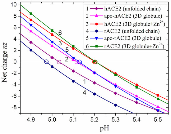 Taking the above considerations into account, we calculated the pH dependence of the net charge nz in the 3D conformation of the catalytic domain, using the crystallographic structure of hACE2 and the reconstructed rACE2, and accounting for the two positive charges of the Zn2+ atom in the active center of the enzyme (Figure 3). The pH-dependent nz (pH) have two steep sections where the net charge changes, being positive at an acidic pH and negative at an alkaline pH (Figure 4).
