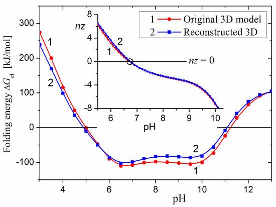 Assuming that the crystallographic models of well-known proteins are the most reliable, we have chosen the horse myoglobin which has a well-known human analogue. For these two human–animal proteins, we have reconstructed the 3D model of the horse analog by the substitution of 18 mutant residues in the human 3D model, according to the difference in the amino acid sequences of the two proteins. The root mean square deviation (RMSD) of the atomic positions of the backbone atoms of original and reconstructed horse myoglobin is 0.076 nm (values under 0.1 nm indicates very high degree of identity). The coincidence of the isoelectric points pI 6.7 and the pH-dependent nz(pH) of the net charge nz of the original and reconstructed 3D models of the horse myoglobin (Figure 11, Insert) are evidence that all mutations are included correctly. Figure 11 shows very close courses of the pH-dependent ΔGel(pH) of the electrostatic component ΔGel of the folding energy of the original and the reconstructed 3D models of horse myoglobine. Taking into consideration the high sensitivity of ΔGel(pH) dependence to a small shift in the atomic coordinates, and also that the optimization procedure is not performed, the nearness of the two pH curves shows that the 3D models (original and reconstructed) can be assumed as practically identical. This verification confirms the procedure for the reconstruction of the 3D model of the rabbit (mutant) protein by substitution of the different amino acid residues in the 3D model of the human protein (Section 2.1).