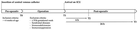 Patients’ blood samples were obtained via the central venous line pre-operatively after the induction of anesthesia (T0), post-operatively upon arrival in the pediatric intensive care unit (PICU) (T1), and both 6 h (T2) and 24 h (T3) after the operation.