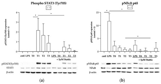 Regarding cellular signaling pathways, the emphasis of many former studies has been on the transcription factor NF-κB [,,]. Furthermore, the pathophysiology of the triggered inflammatory reaction and the associated complications is still not fully understood. In our study, we focus on the evolutionarily conserved JAK-STAT3 pathway, which can be activated by inflammatory mediators such as IL-6 []. The JAK-STAT3 pathway plays a major role in regulating the immune response by modulating the expression of various cytokines and mediators for vascular permeability [,]. Moreover, multiple crosstalk mechanisms are being described between the STAT3- and NFκB-signaling pathway. Lee et al. demonstrate a constitutive NFκB activity maintained by STAT3 in cancer cells via complex formation with NFκB subunits and the direct modulation of the gene expression of components important for NFκB signaling []. IL-6 is released by different cell types including macrophages, T cells, and endothelial cells, and is an important mediator in acute inflammatory reactions by modulating the balance between pro- and anti-inflammatory mediators; by interfering in the cell growth, survival, and differentiation; or by promoting the production of acute-phase proteins [,]. Particularly in pediatric patients, IL-6 is already an established biomarker for Sepsis [,].