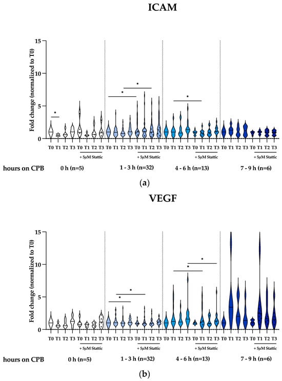 We further investigate the expression of the mediators of vascular permeability, ICAM and VEGF, as well as the inhibitor of the Stat3 activation molecule, SOCS3. We observed a significant decrease in ICAM expression in patients not requiring CPB (0 h) at T1 (p = 0.0051), but no significant changes in patients undergoing CPB, as shown in Figure 5a. Interestingly, Stattic significantly increased ICAM expression in the 1–3 h CPB group at T0 (p = 0.0430) and T2 (p = 0.0207) but decreased ICAM expression in the 4–6 h CPB group at T1 (p = 0.0368). For VEGF expression, we observed a significant increase only in the 1–3 h CPB group at T3 (p = 0.0252), as shown in Figure 5b. Stattic significantly attenuated VEGF expression in the 1–3 h CPB group at T1 (p = 0.0004) and in the 4–6 h CPB group at T1 (p = 0.0057) and at T3 (p = 0.0091). SOCS3 expression was significantly upregulated in the 1–3 h CPB group at T1 (p = 0.0465), as shown in Figure 5c. Stattic increased SOCS3 in the 1–3 h CPB group at T1 (p = 0.0252). Additionally, the data are also shown in sub-groups with respect to patients’ age, children (0–18 yrs old) and adults (18–65 yrs old), in Figure S2 of the supplementary file.
