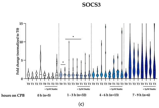The combined effect on the signaling pathways resulted in a significant increase in IL-1β, TNFα, and IL-10 expressions 24 h post-operatively (T3) for patients who underwent moderate durations of CPB. Blocking Stat3 activation by Stattic partially attenuated IL-1β and IL-10 expressions at some observed time points but significantly augmented TNFα expression at basically all investigated time points after the operation after stimulation with serum samples from the same patients (Figure 3a, Figure 3b, and Figure 3c, respectively). Our findings correlate with those of de Jong et al., who reported that the abrogation of the IL-10/STAT3 pathway restored in vitro in LPS-induced TNF-α production in human PBMC isolated from a pediatric cohort undergoing CPB-assisted surgery to correct simple congenital heart defects was independent of p38 MAPK attenuation or IκB-α degradation [].